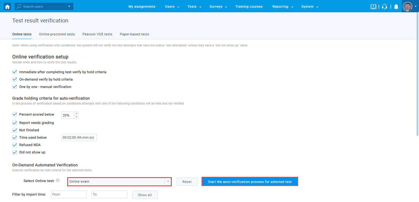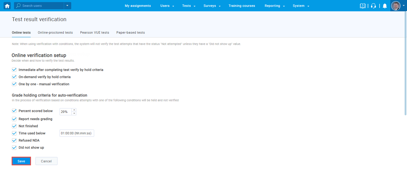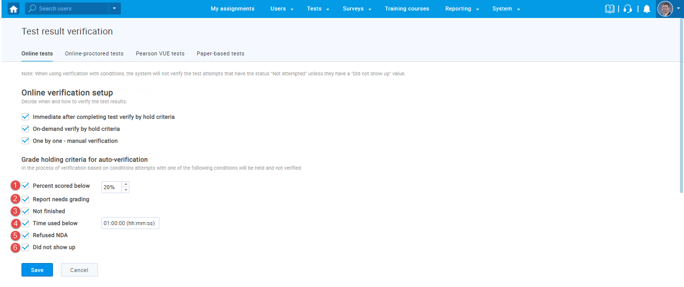 - Not finished – If this option is enabled, the results of the candidates who did not finish the test will be held and not verified.