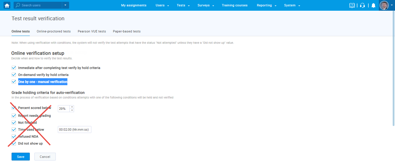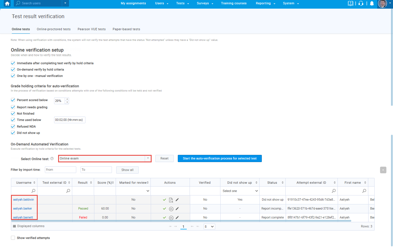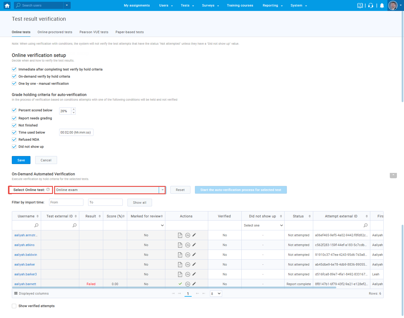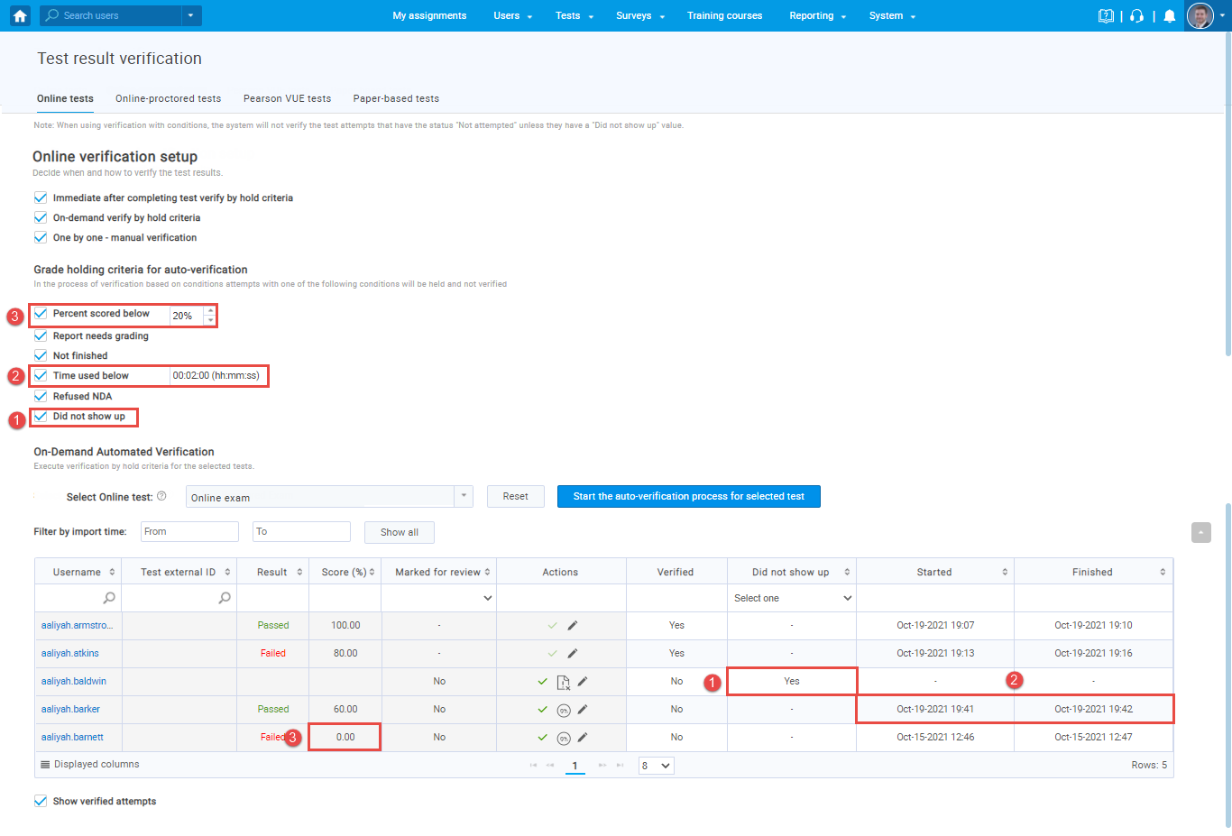 - Did not show up – If this option is enabled, results of the candidates that did not take the test within the allotted time will be held and not verified.