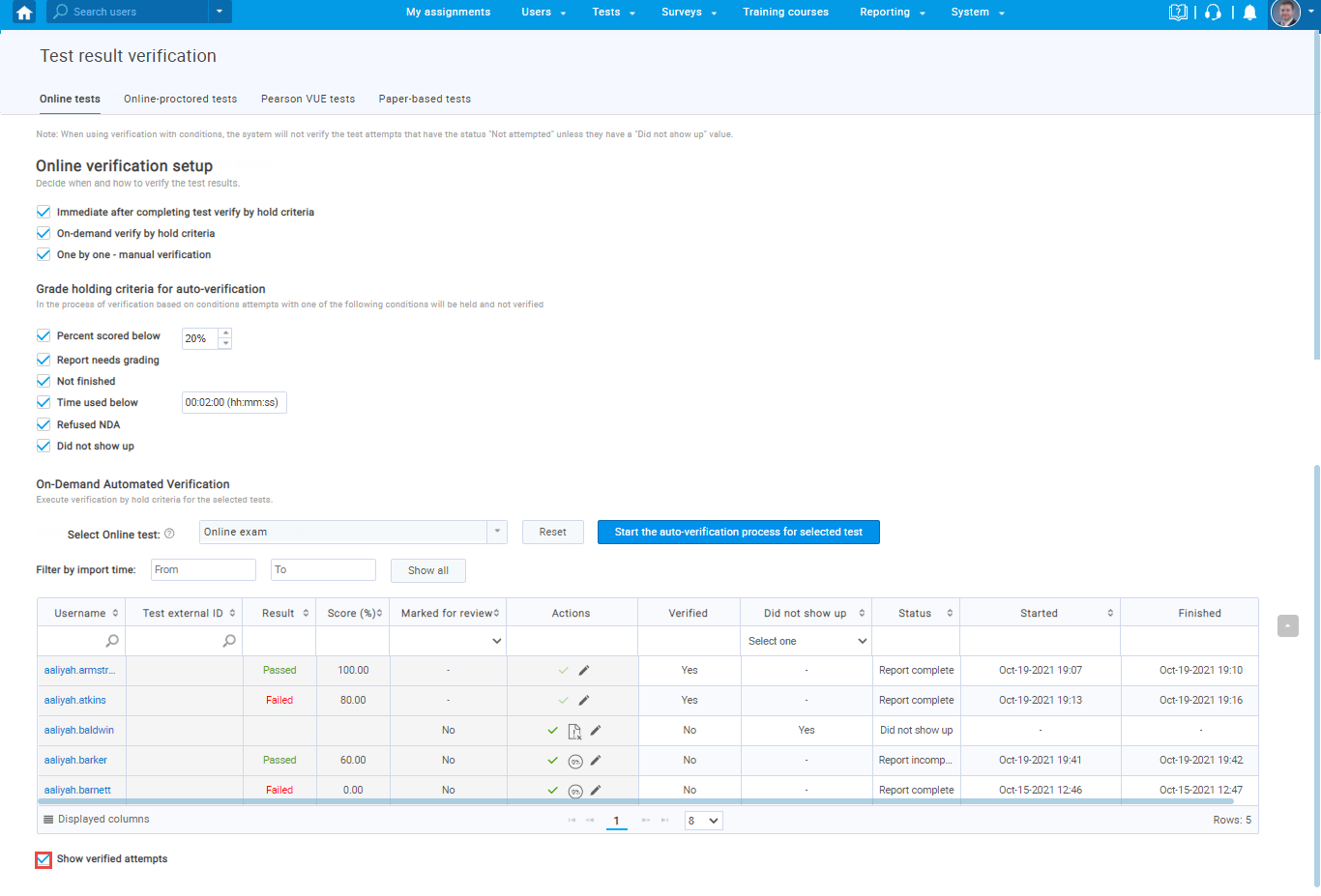By default, in the table will appear only non-verified test attempts. To display verified attempts also, you should enable the “Show verified attempts “option.