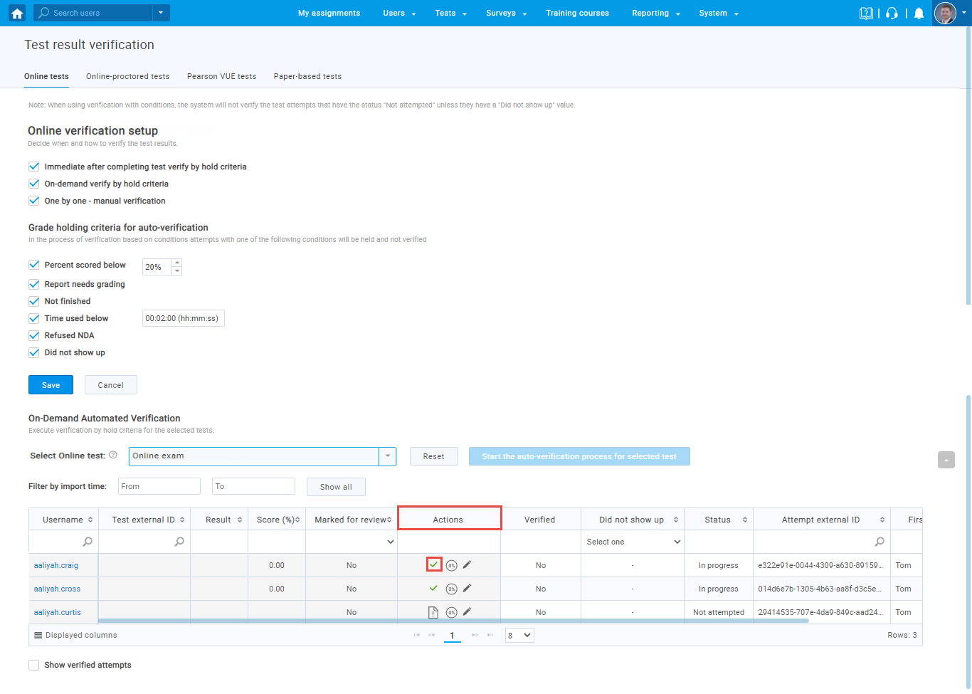 For the selected online test, you can verify one-by-one attempts by pressing on the checkmark in the “Actions” column.
