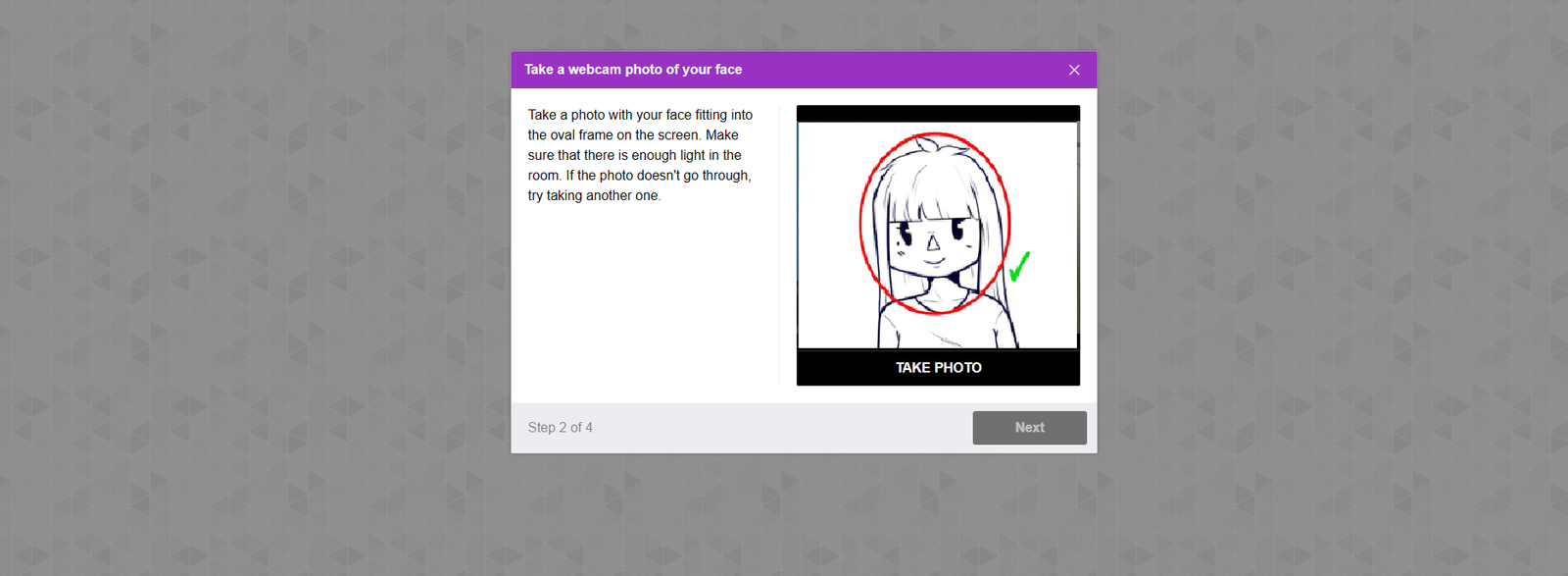 - Your webcam will activate, allowing you to take a photo of your face.