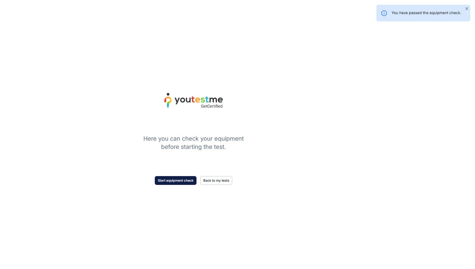 To ensure a smooth experience, candidates can run an equipment check before the actual test. This simulation follows the same check-in steps configured for the test, allowing candidates to confirm their setup and troubleshoot any issues in advance.