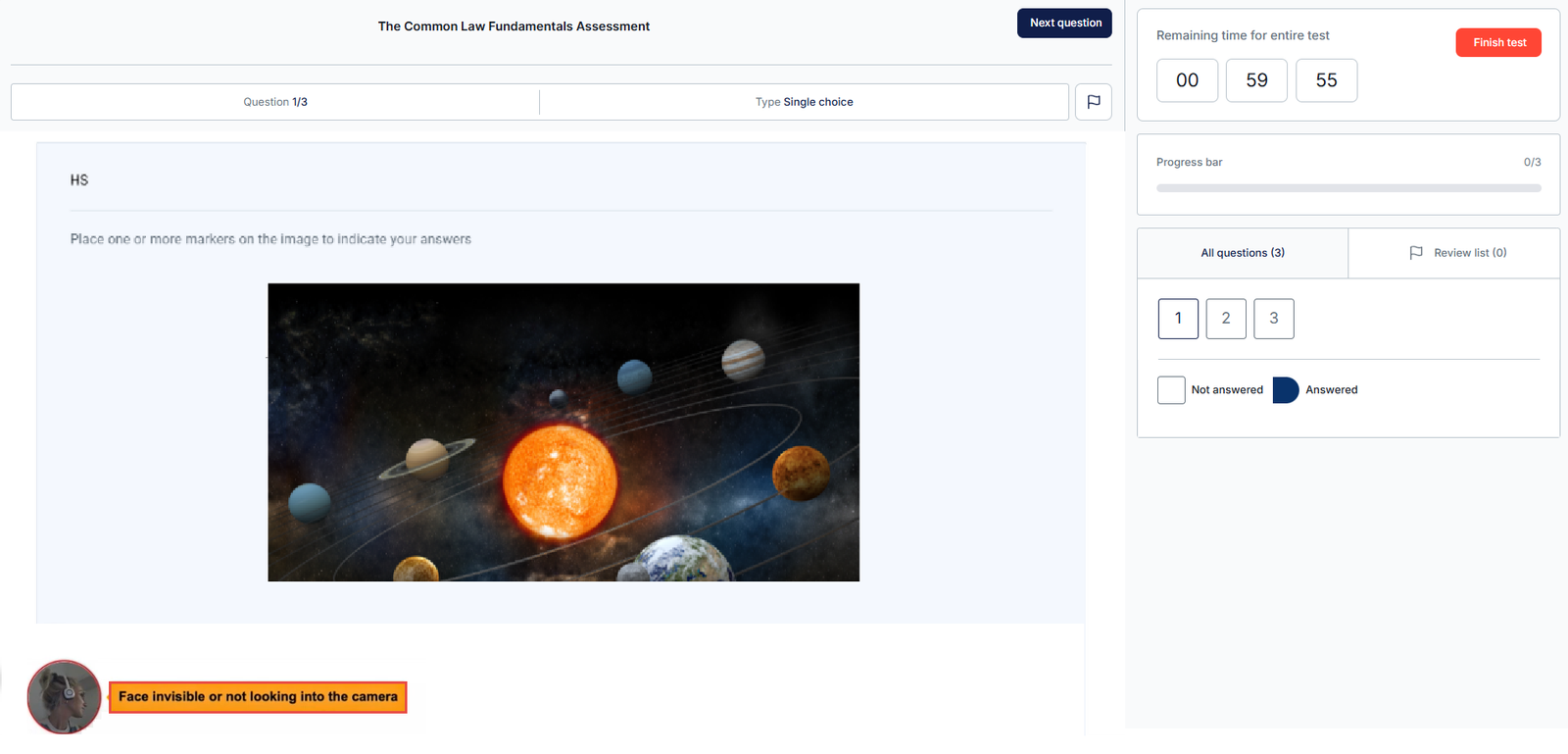 During the test, your screen and video will be recorded continuously. A video thumbnail will appear in the bottom-left corner of the screen to display your video feed. The system uses artificial intelligence to monitor the test process and will issue warnings if test rules are not followed. Please watch this walkthrough video to familiarize yourself with the process of taking a proctored test.