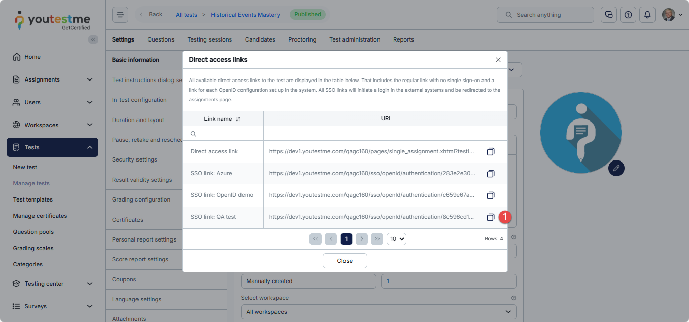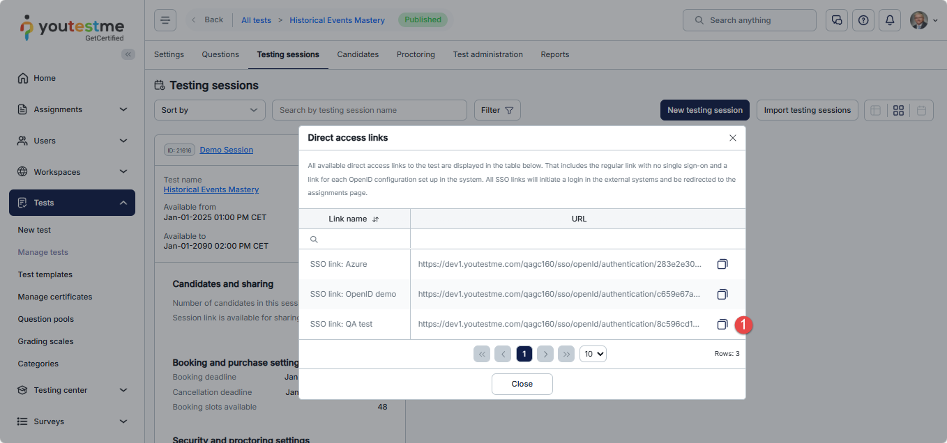 The SSO link allows direct access to a specific test with a Self-Enrollment Testing session on the YouTestMe application. To learn how to create a Self-Enrollment Testing session for a test refer to this article.