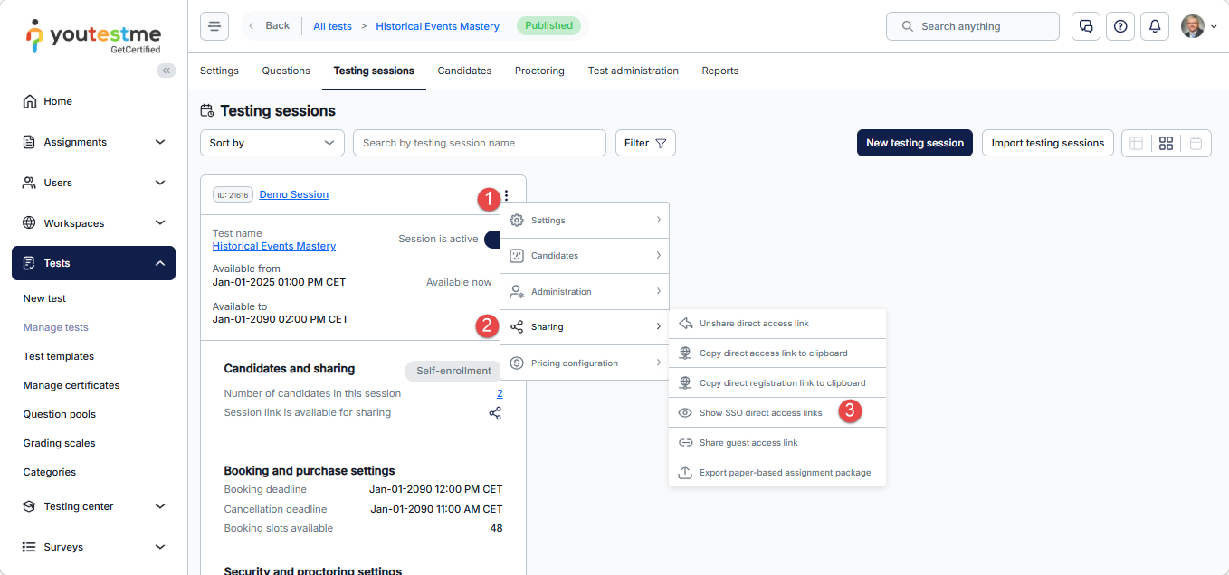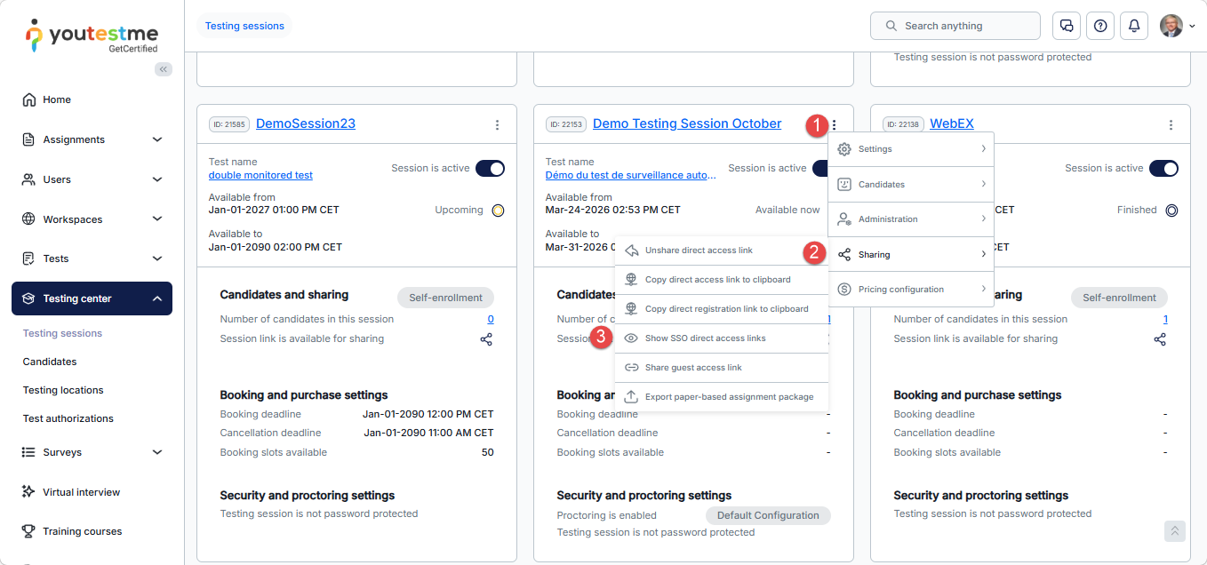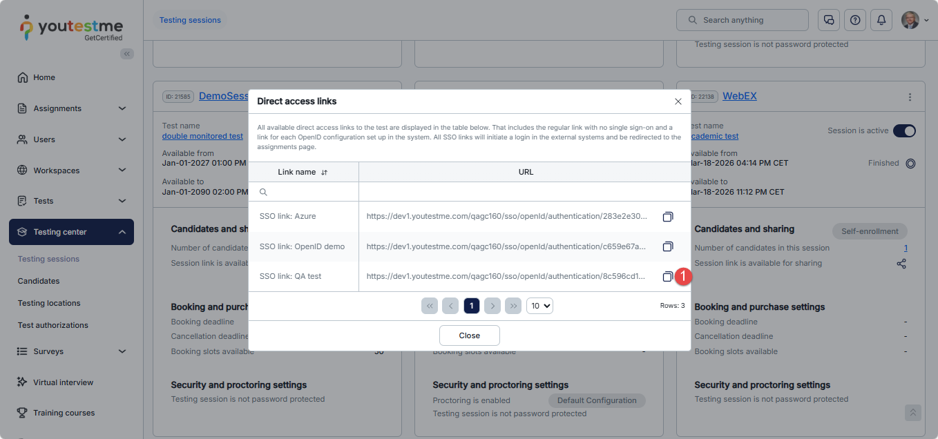 The second way of gaining access to an SSO link is on the Testing Sessions page. To gain access to an SSO link on the Testing sessions page, do the following: