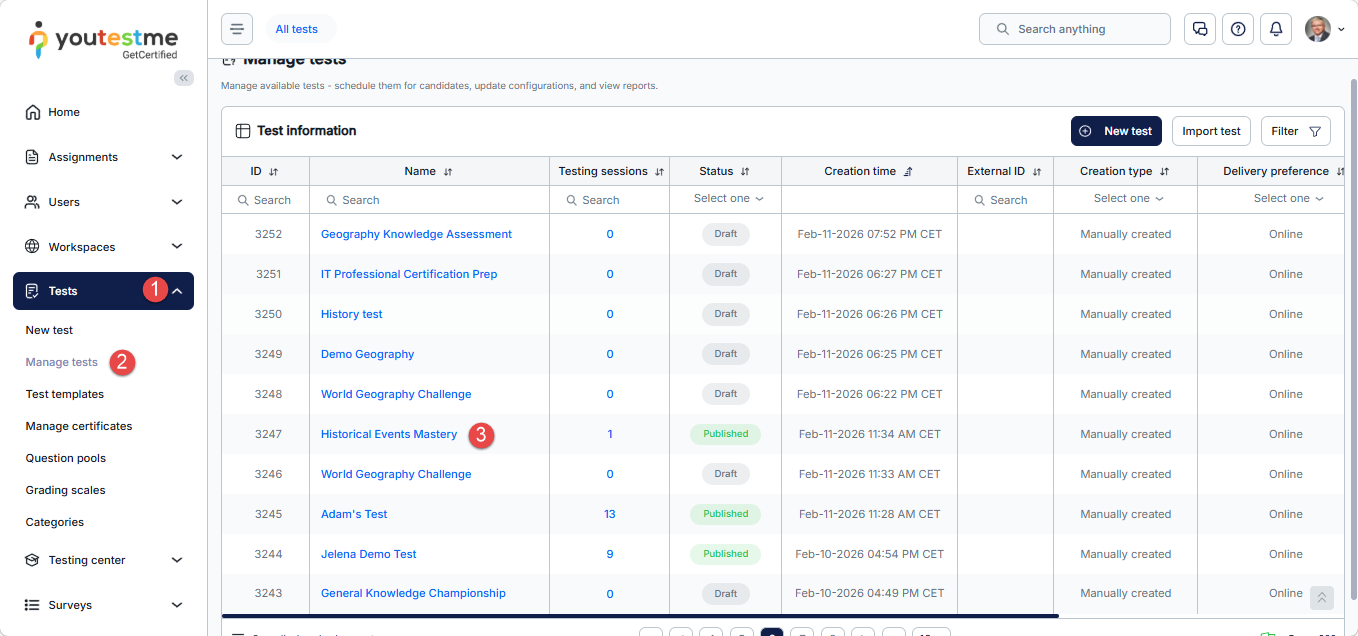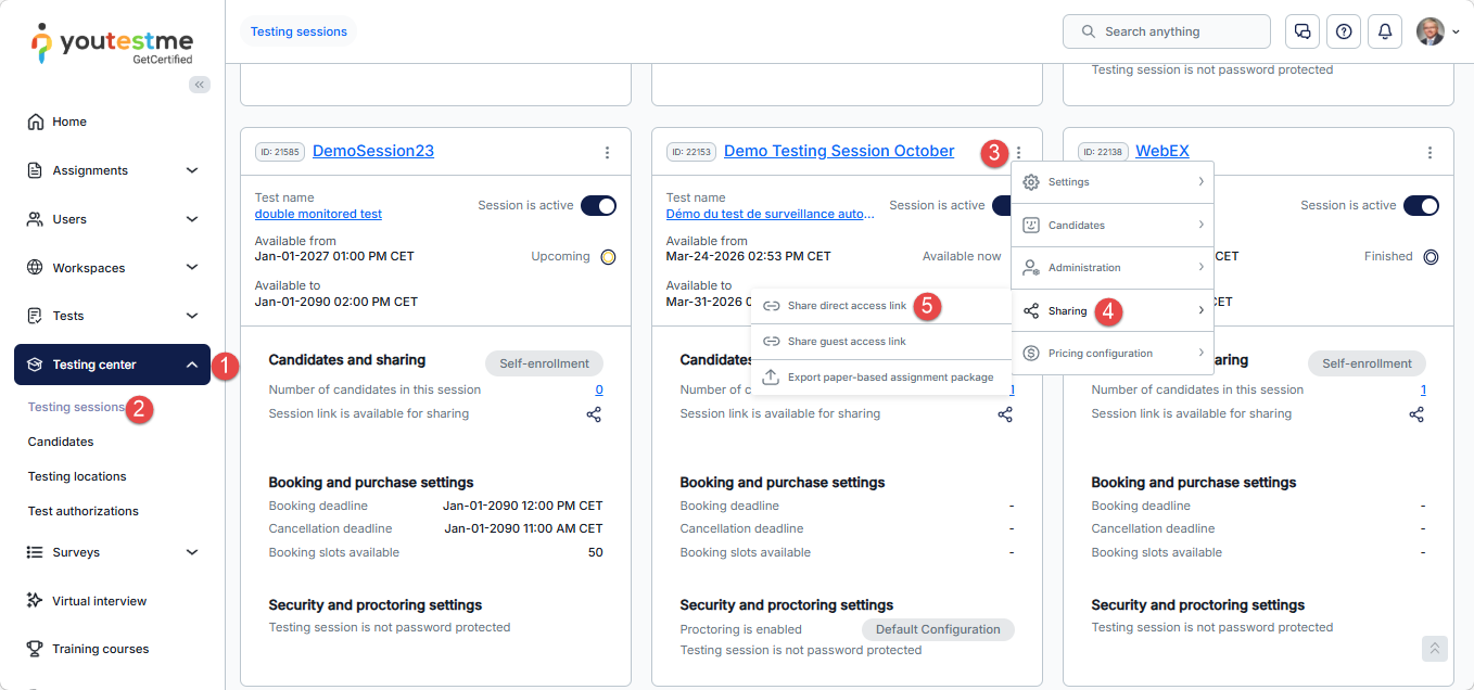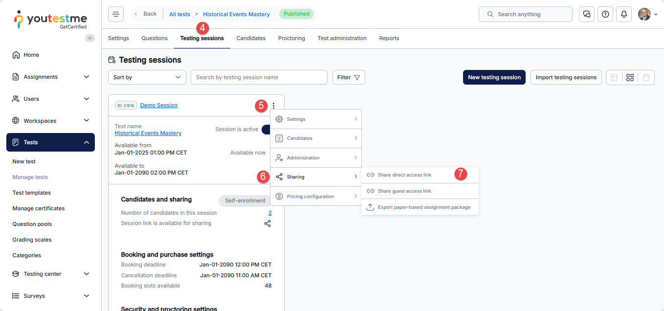 - Open the test that has a self-enrollment testing session. To learn how to create a Self-Enrollment Testing session visit this article.