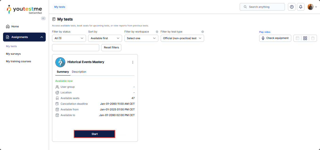 3. After a successful log-in, you will be redirected to the Youtestme.com application. On this page, you will be able to start the test by clicking on the “Start” button.