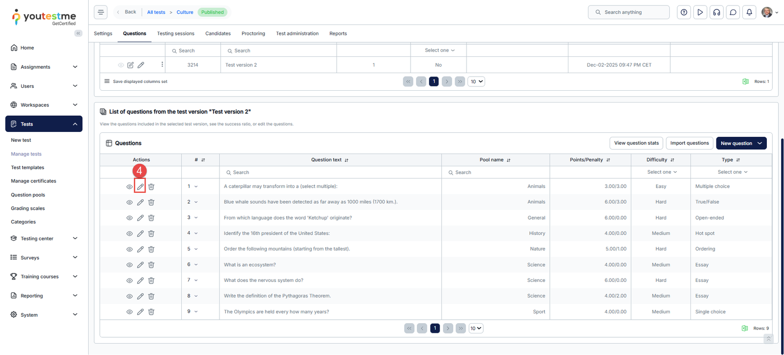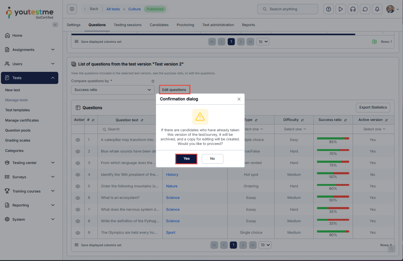 Changed questions will be automatically displayed in new test versions for new test attempts.