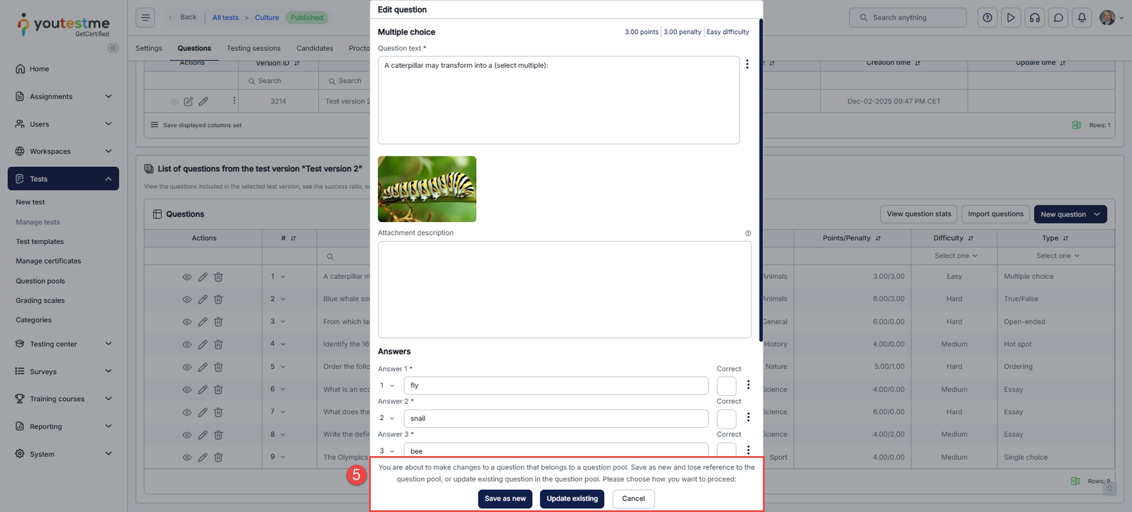 - Update Existing: The changes will be applied to the existing question in the pool, preserving the connection. Future test attempts will use the updated version.