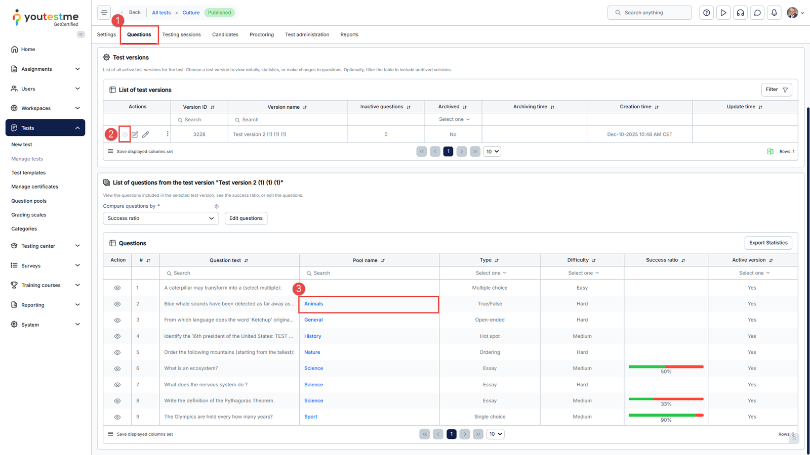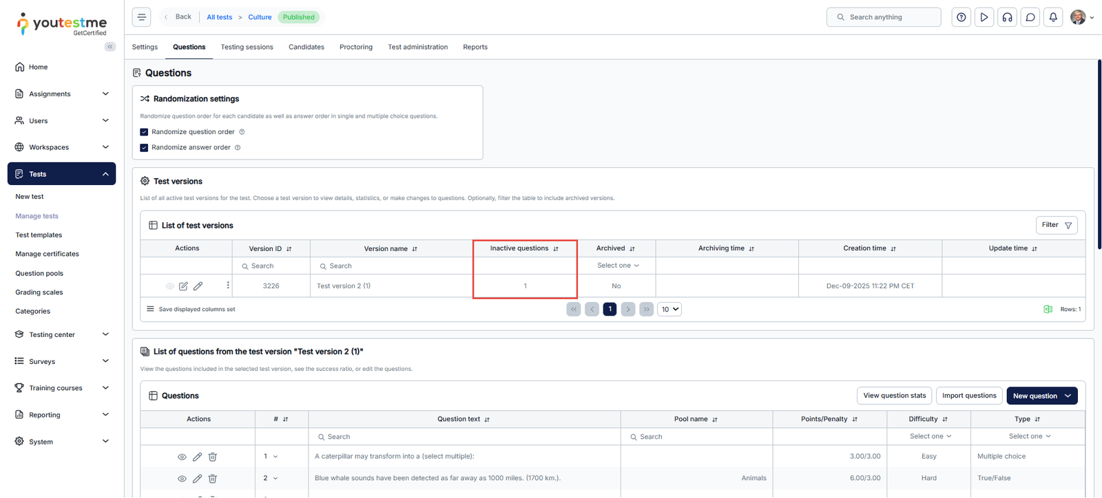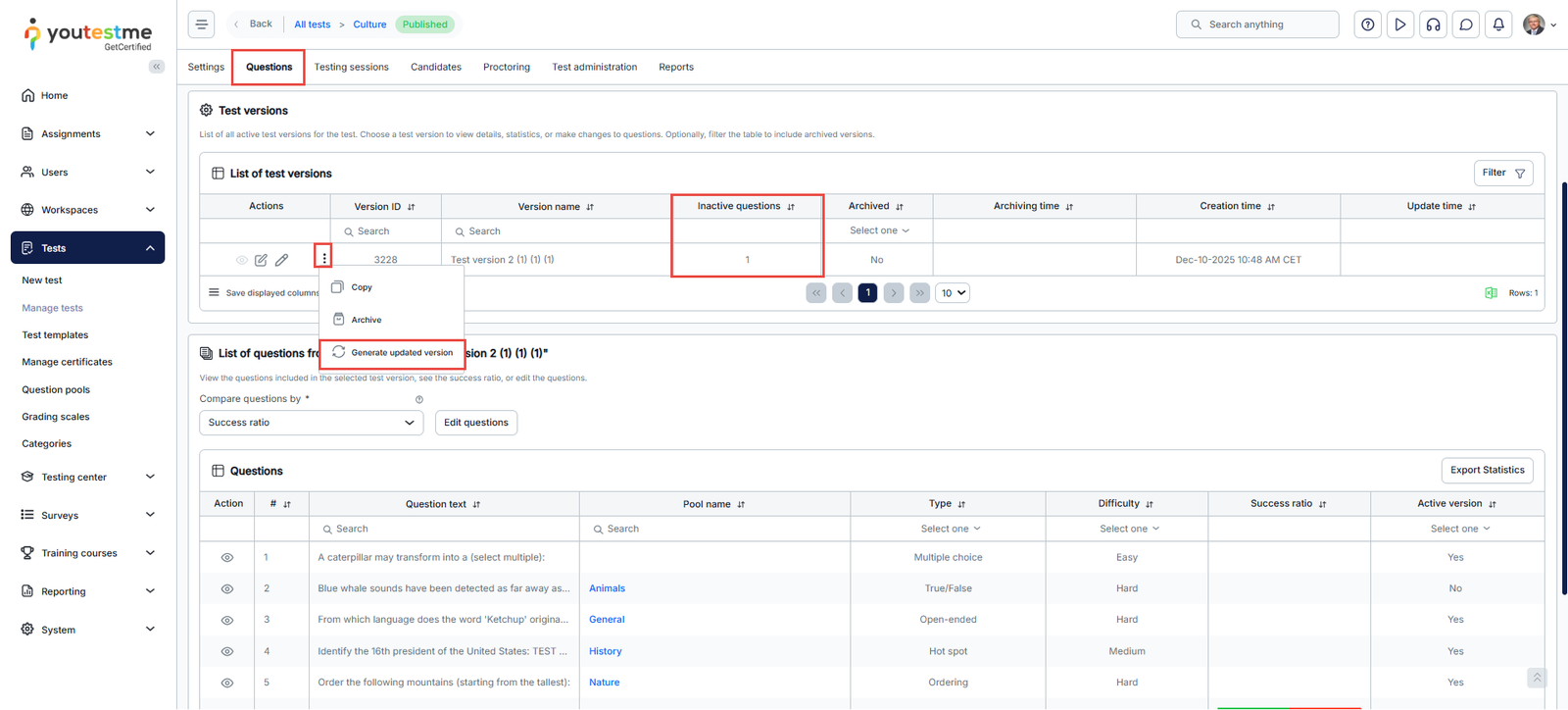 - Once the question is updated in the pool, the previous version becomes inactive in all tests that contain it, regardless of the test type. To apply the updated question to those tests, a new test version must be generated.