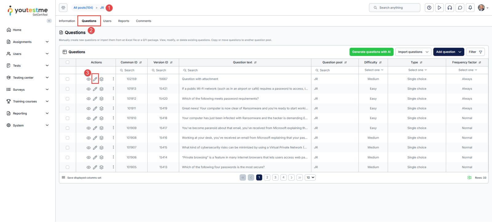 - Click the view icon to see the question list and check the pool name of the question you wish to edit.