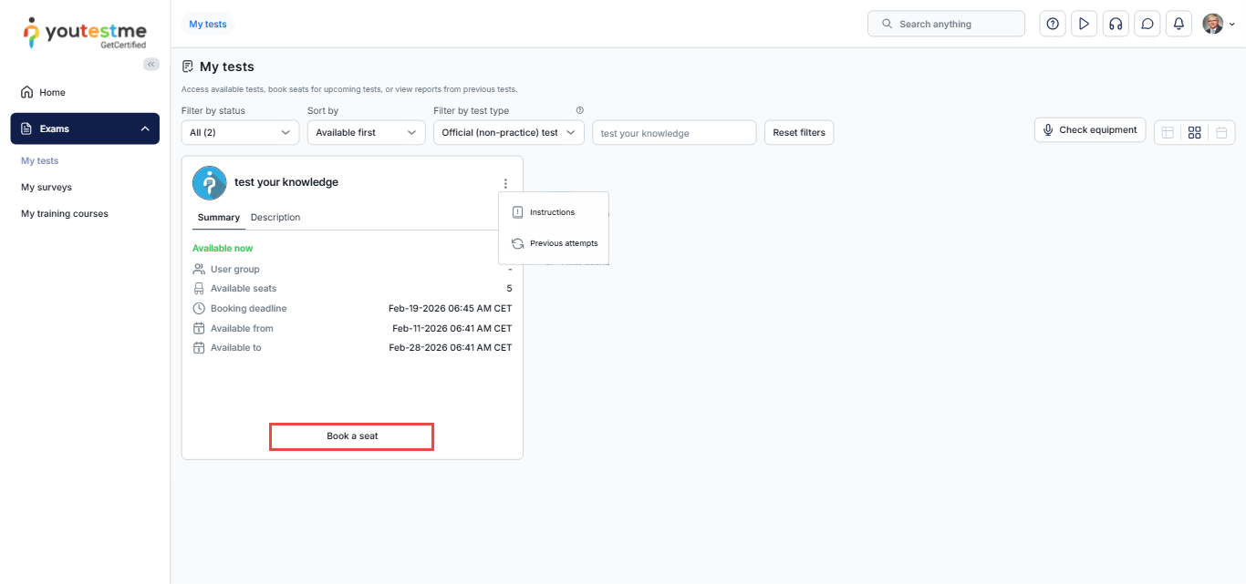 Note: If a testing session is set to self-enrollment, the candidate must book the exam before requesting a special accommodation. If the candidate clicks the three-dot menu before booking the exam, the Request Special Accommodation option will not be available.