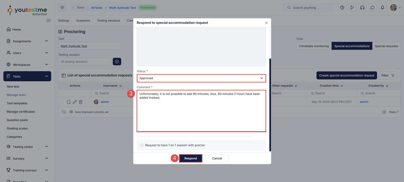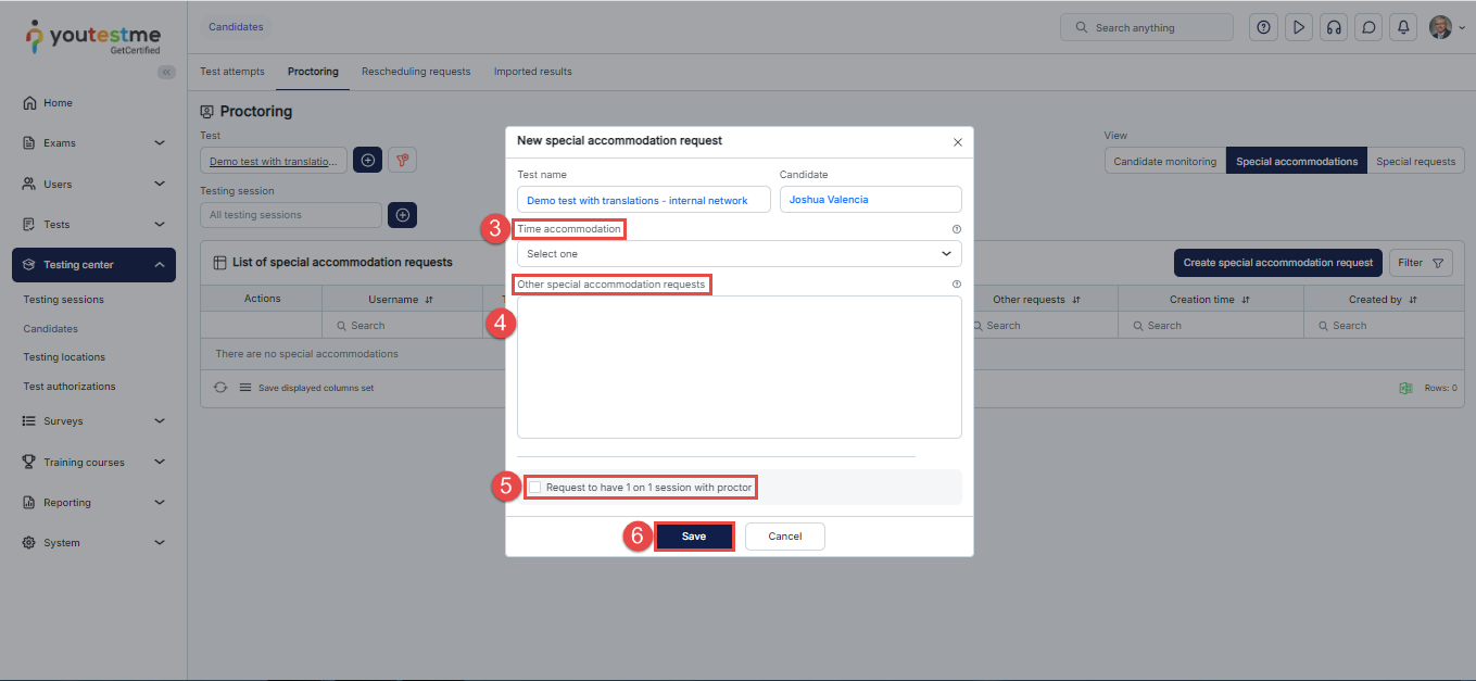 Enter any custom accommodation text if applicable (e.g., “allow water bottle”) - Optionally, check the box to assign a 1-on-1 session with a proctor.