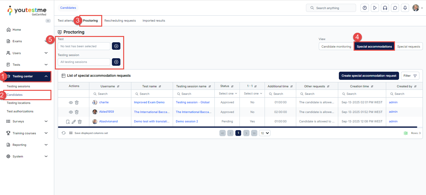 - You will see a list of all special accommodations in the system, where you can filter requests by test name and session.