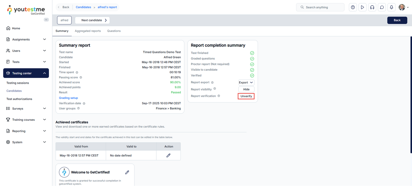 Depending on the personal report settings configured for each test, results may be set to become visible to test-takers only after verification by a test manager or another user with the appropriate permissions.