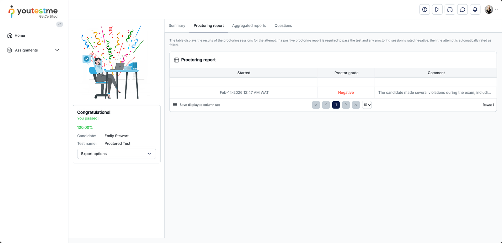 After the test, the proctor rates it and enters their observations in the comments section, which can be used to review and verify the results before they are released to the candidates.