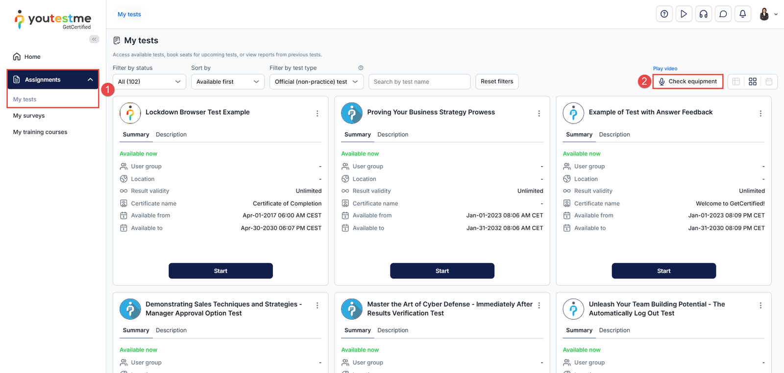 To ensure a smooth experience, candidates can run an equipment check before the actual test. This simulation follows the same check-in steps configured for the test, allowing candidates to confirm their setup and troubleshoot any issues in advance.