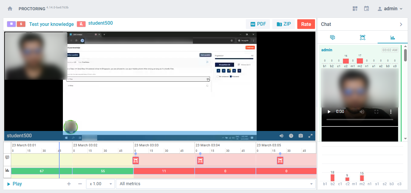 Furthermore, two types of credibility reports can be obtained. The first one is interactive and includes a recorded video of the student who took the proctored test. Meanwhile, the second type is a PDF report. This report can be exported for each student who took the proctored test.