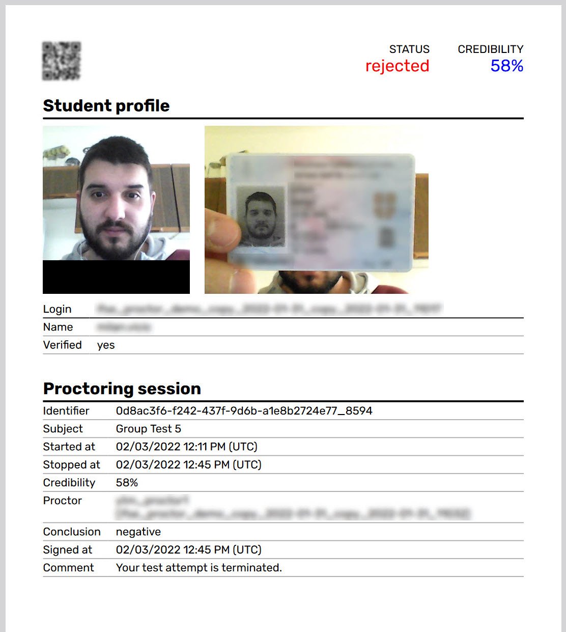 A proctoring credibility report is a document generated automatically. Specifically, the report objectively evaluates the proctoring process. This includes any violations during the exam or assessment.