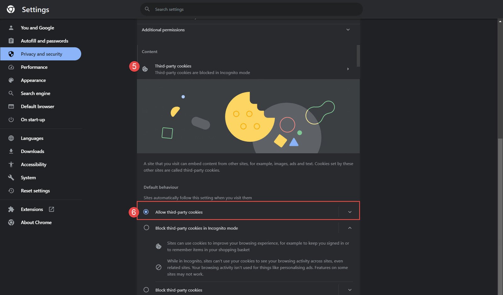 - Click on the Allow third-party cookies. Alternative: Enter “chrome://settings/content/cookies” in the address bar and disable Block third-party cookies.