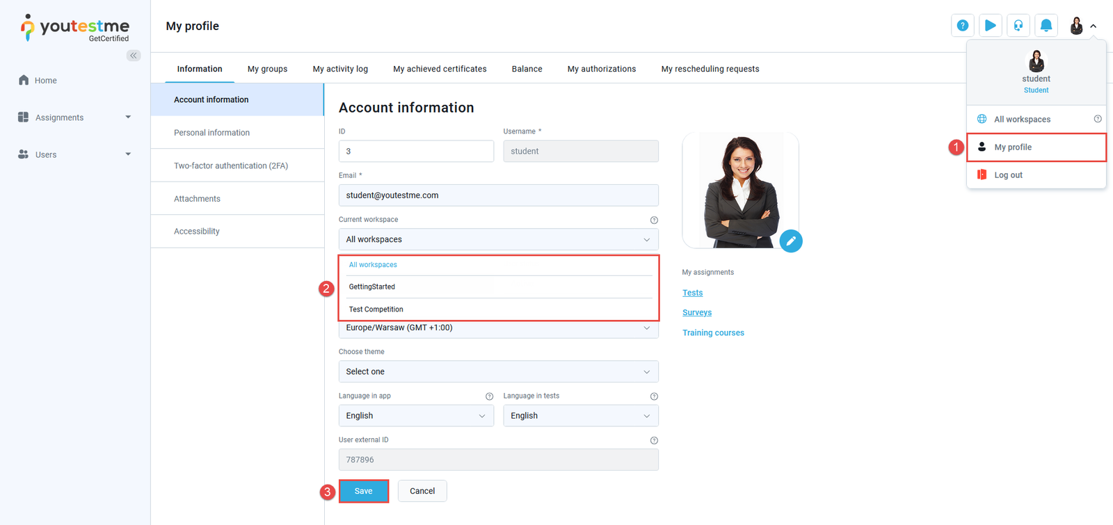 Select a workspace they want to assign as the default under the Current workspace dropdown field.