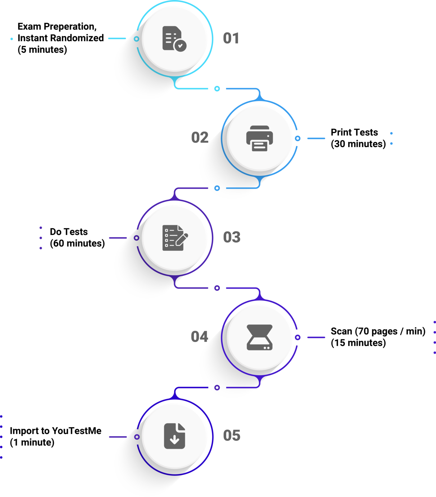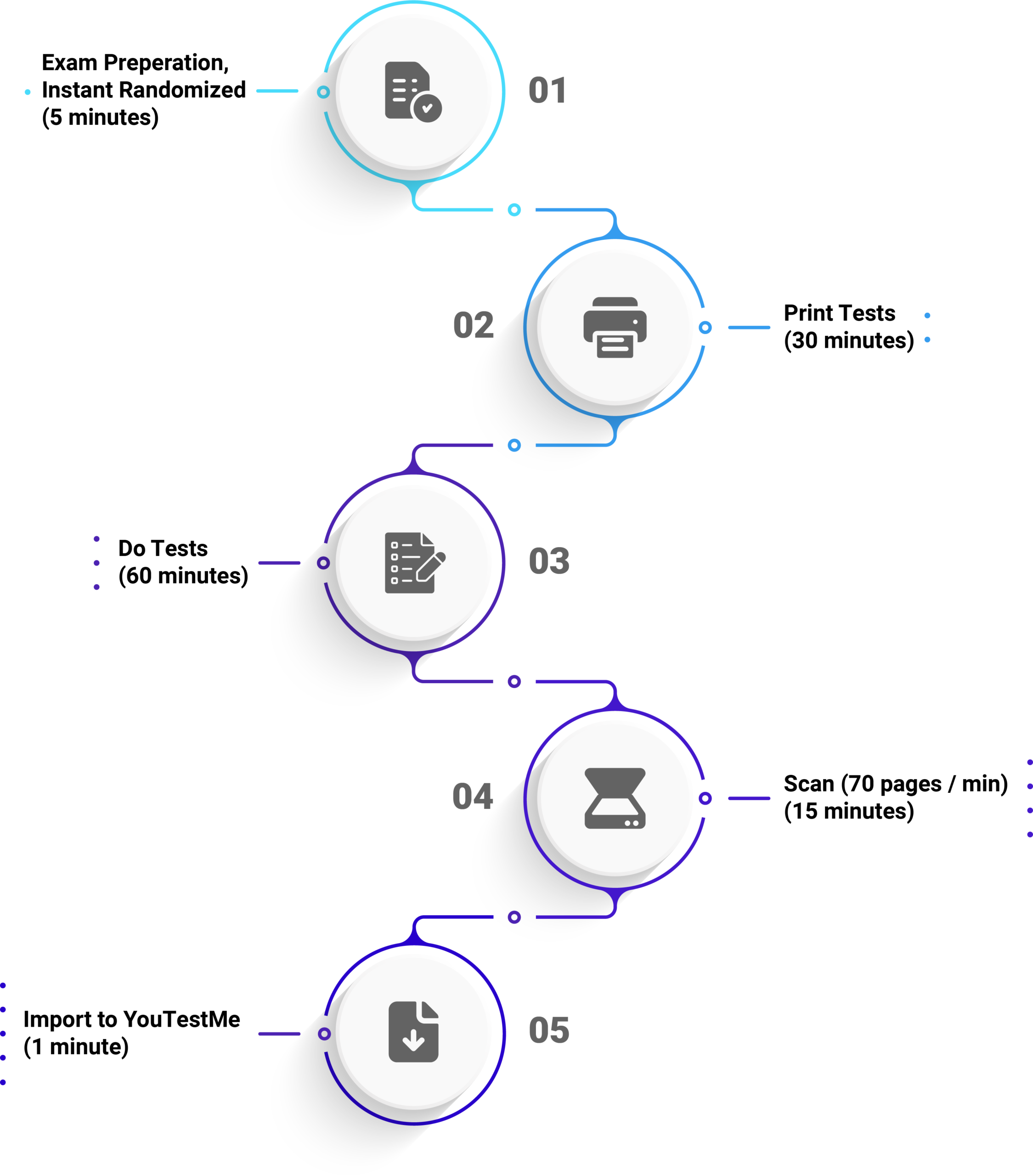 With YouTestMe, you can seamlessly blend the familiarity of traditional exams with the power of modern technology, creating a streamlined, efficient process from start to finish. Say goodbye to manual grading and distribution - you can automatically scan up to 100 test results per minute, saving countless hours and reducing human error. Whether you're administering a small exam or managing large-scale assessments with thousands of candidates, YouTestMe makes it easy to create, manage, and evaluate tests with precision and speed. Upgrade your testing process without sacrificing the integrity or reliability of the traditional approach.