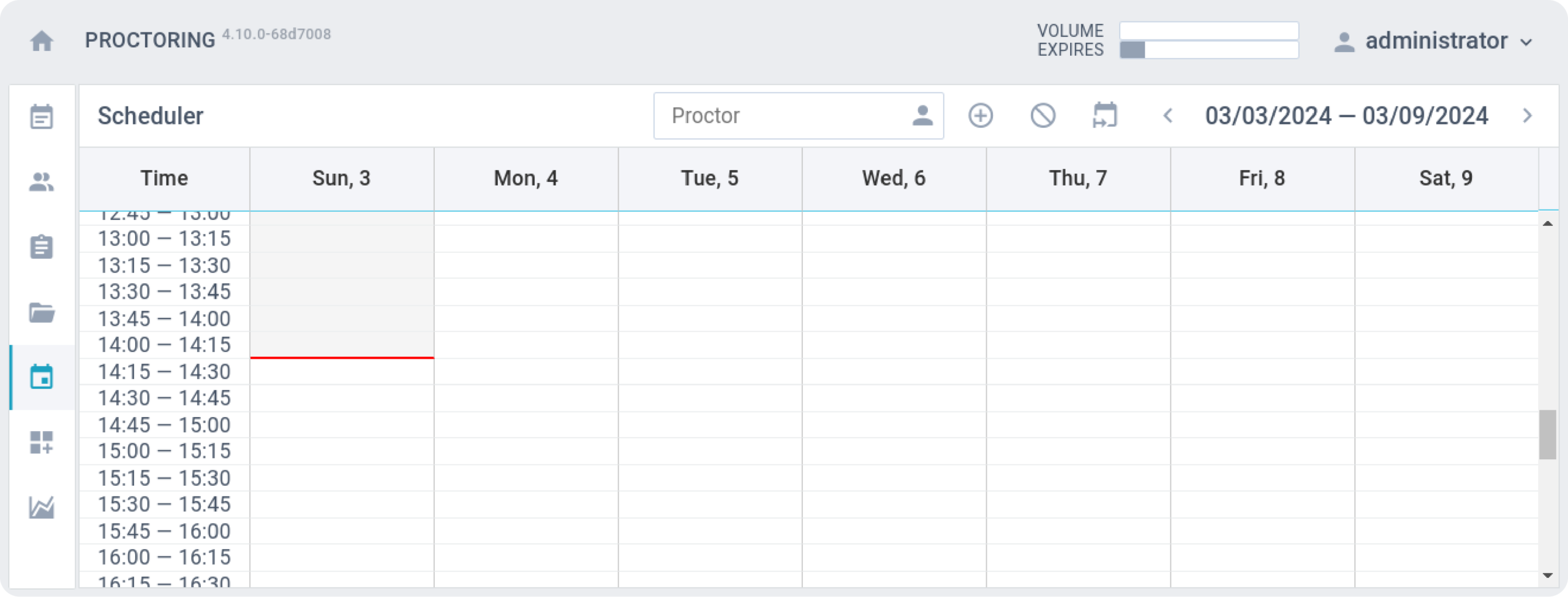 Check out our "Proctors Schedule Planner" interface - it's designed for administrators like you to effortlessly manage proctoring schedules with precision. With this intuitive platform, you can easily oversee, create, and remove time slots, all neatly organized into 15-minute increments. It's all about empowering you to streamline your time management process seamlessly.